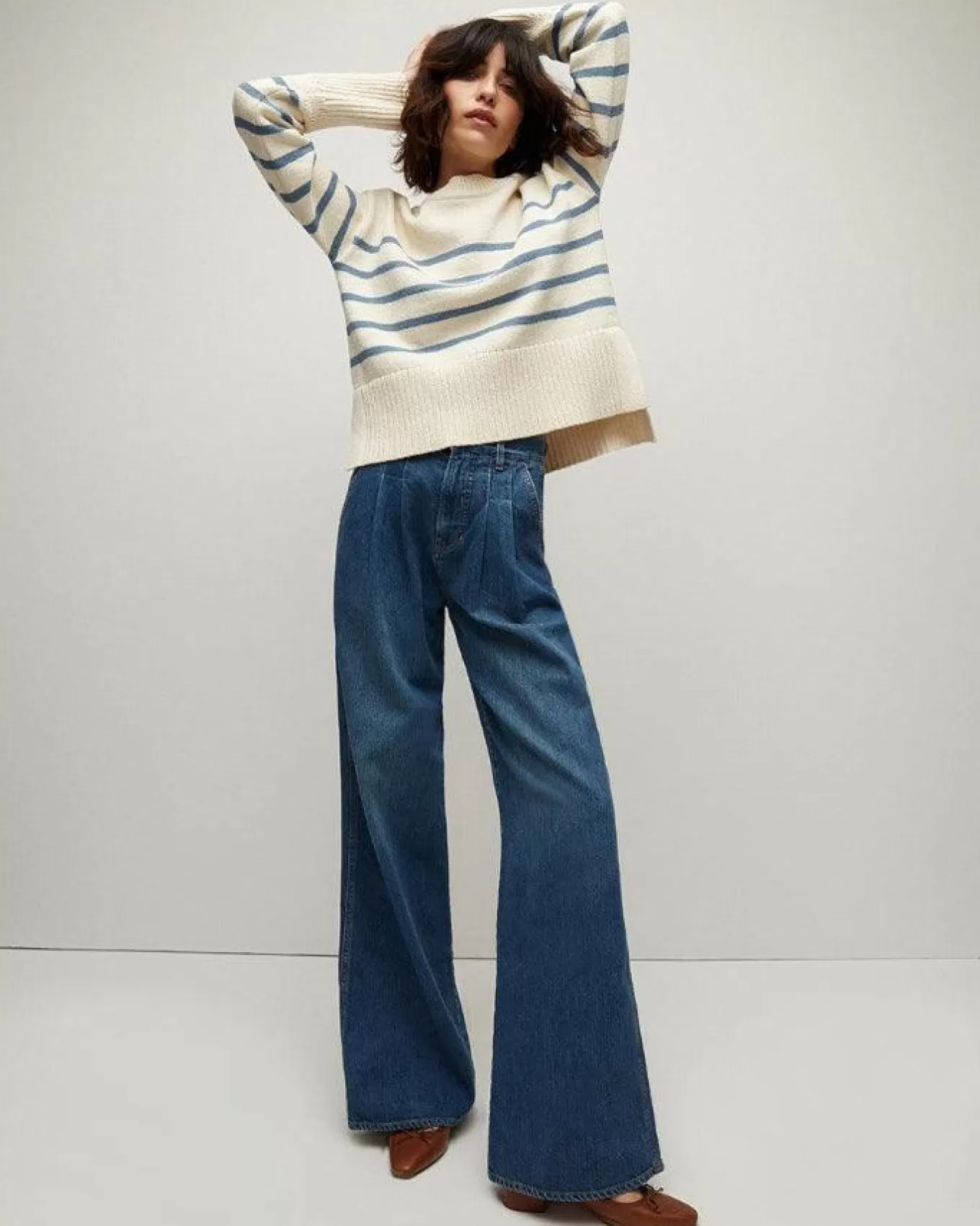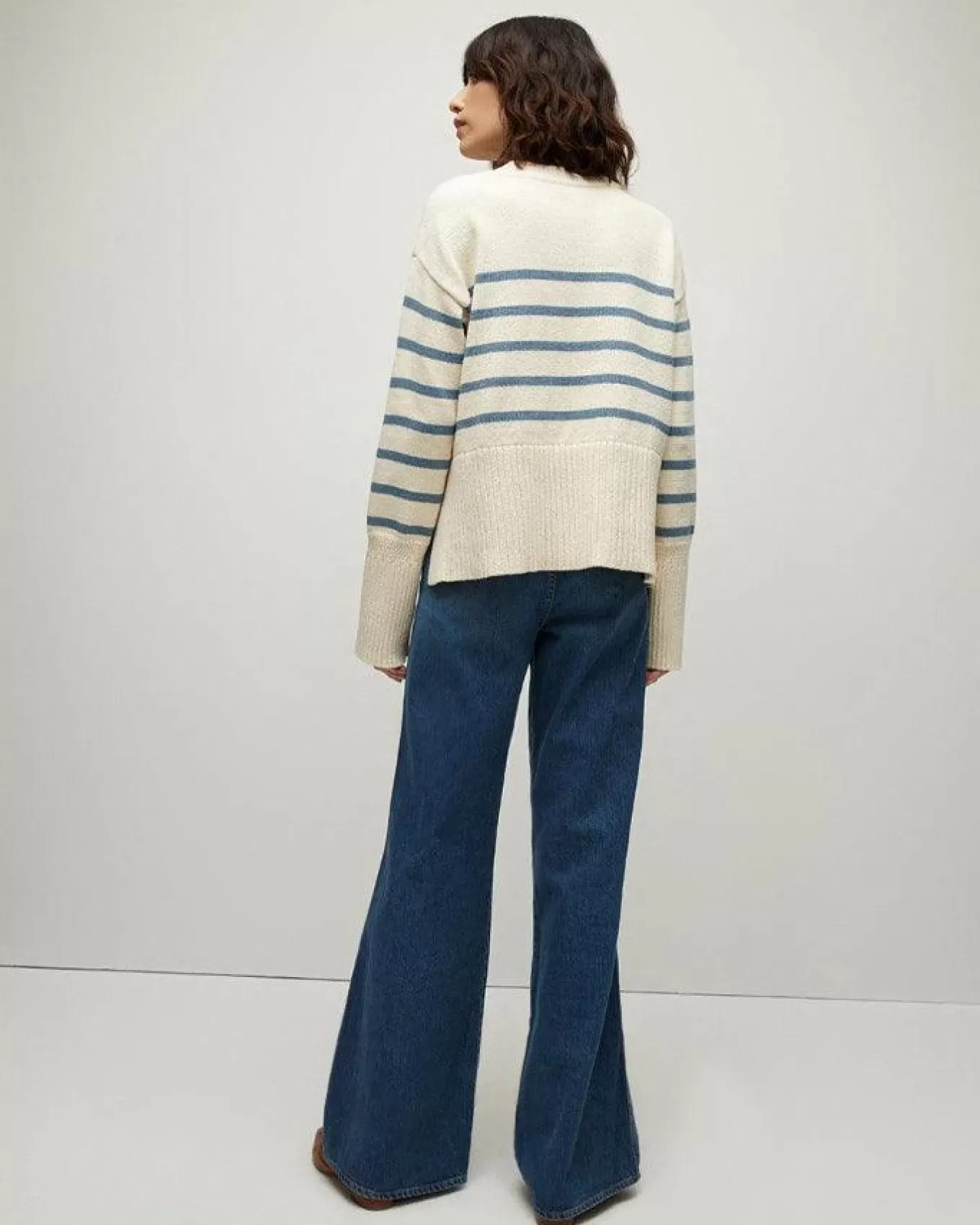 The extra-long ribbed sleeve cuffs add a stylish detail, extending the line of your arms for an elegant silhouette. Finished with a high-low hem, this sweater is not just a garment but a statement of refined taste and versatility. Whether paired with tailored pants for a polished look or casual jeans for a laid-back vibe, the Andover Striped Sweater promises to keep you looking effortlessly chic in any setting., Size S – Sleeve length 31 1/4” , Length 23”