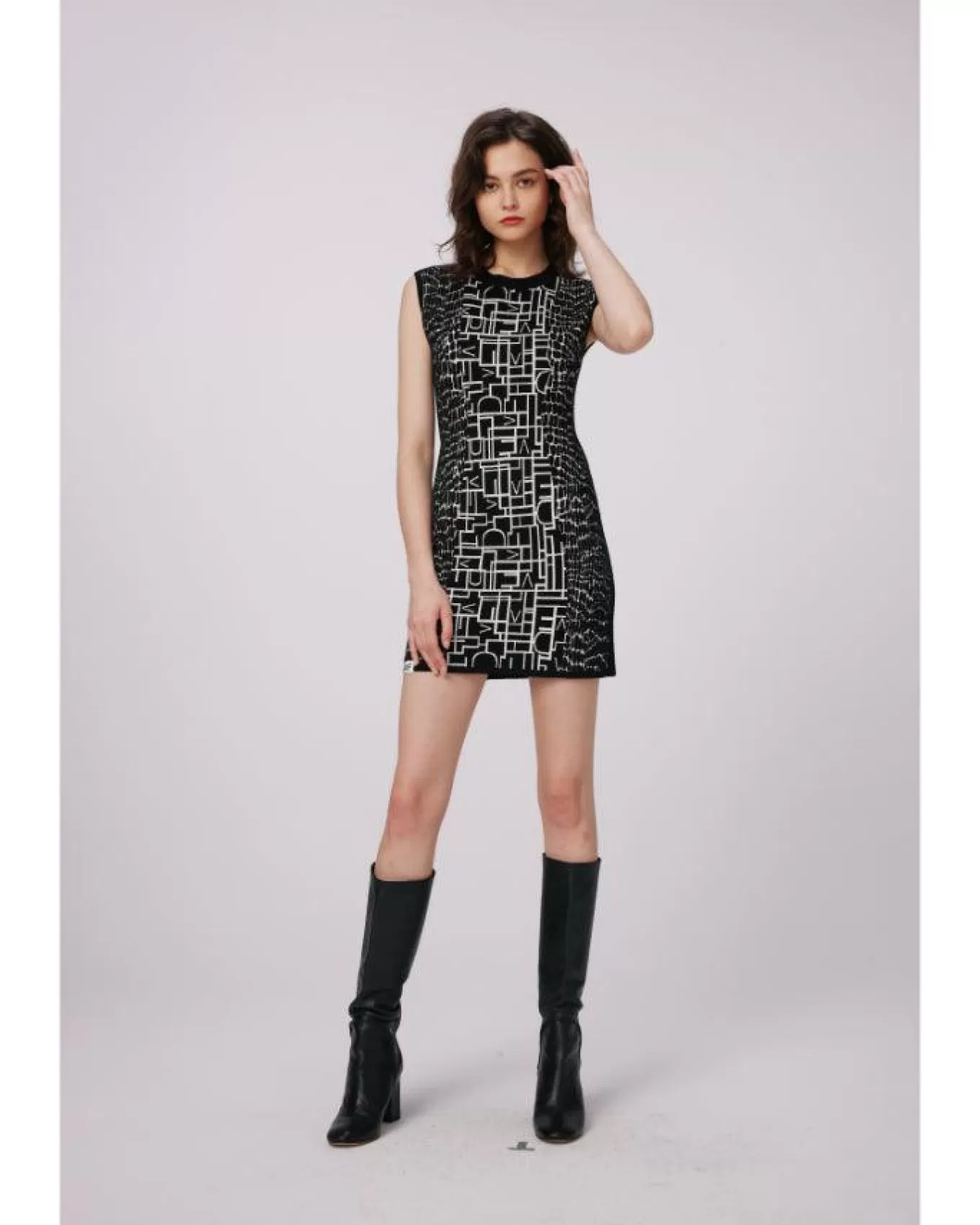 Diane Von Furstenberg close fit knit REVERSIBLE sleeveless mini dress with crew neck features a logo print front, leopar…