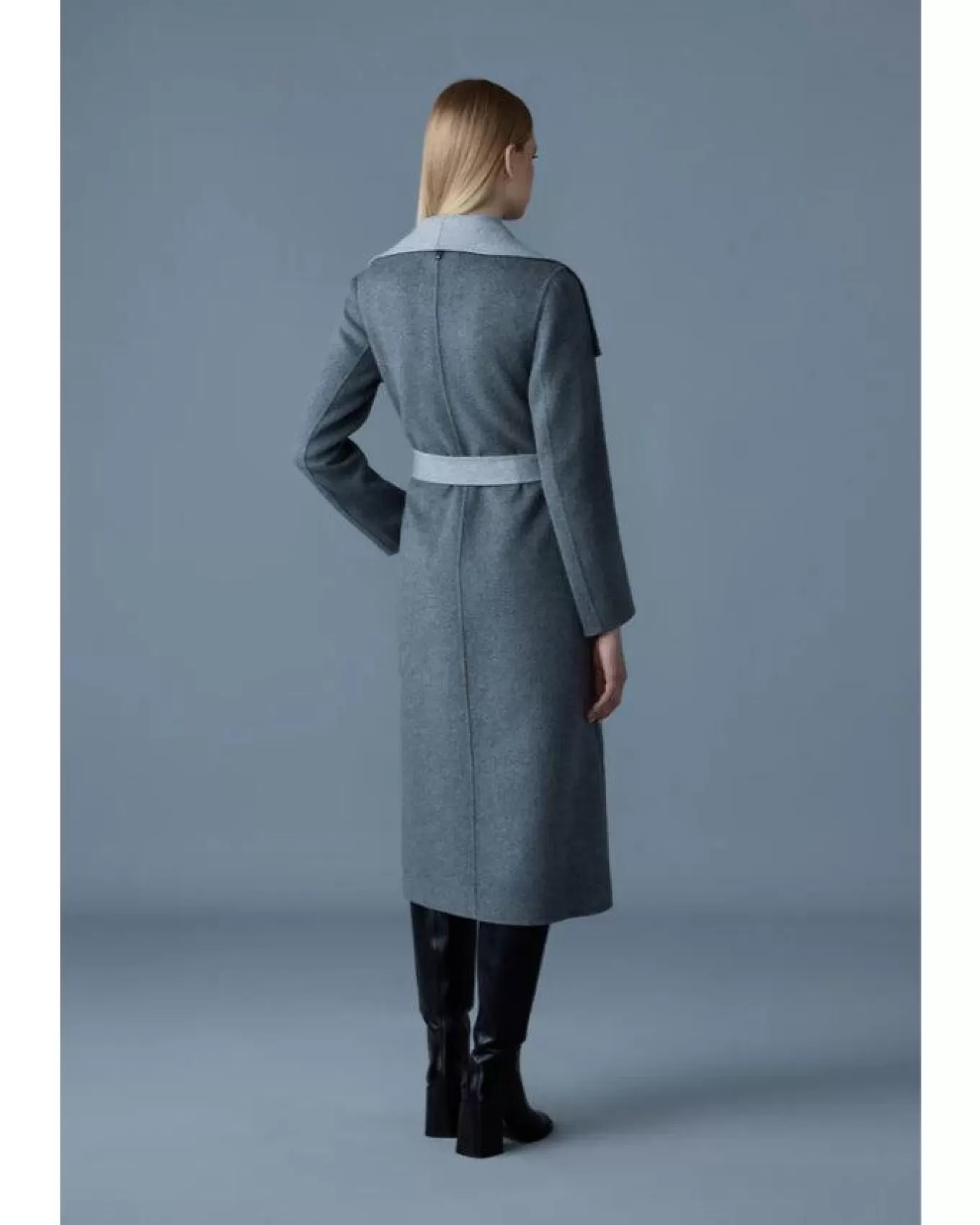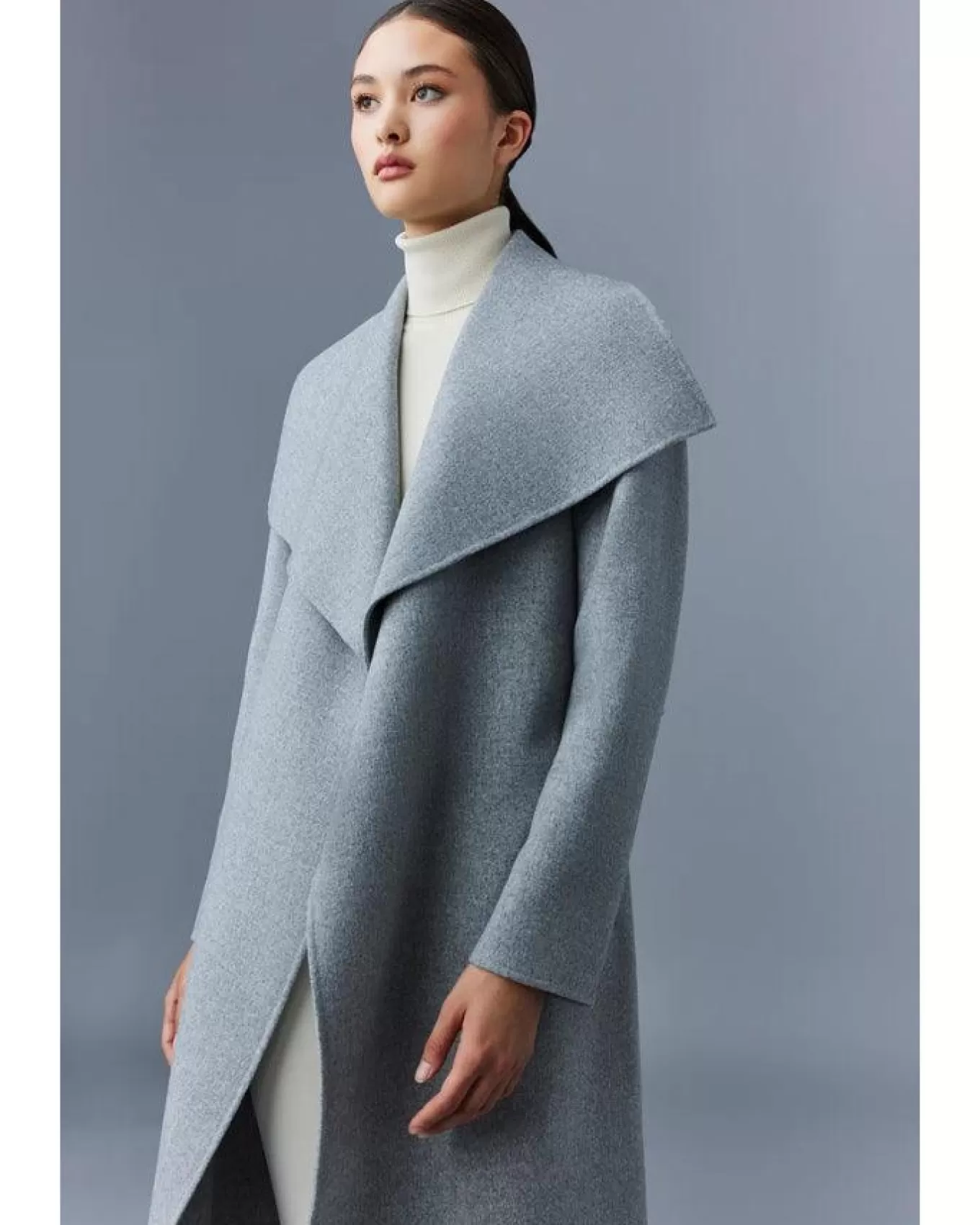 Mackage relaxed fit luxurious soft double face wool long wrap wool coat with waterfall collar, leather welting on waist …