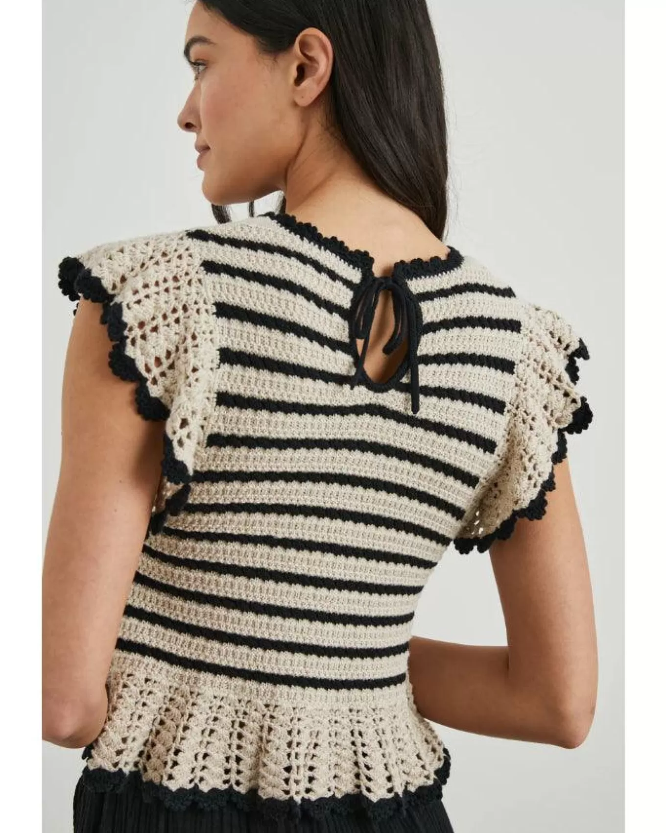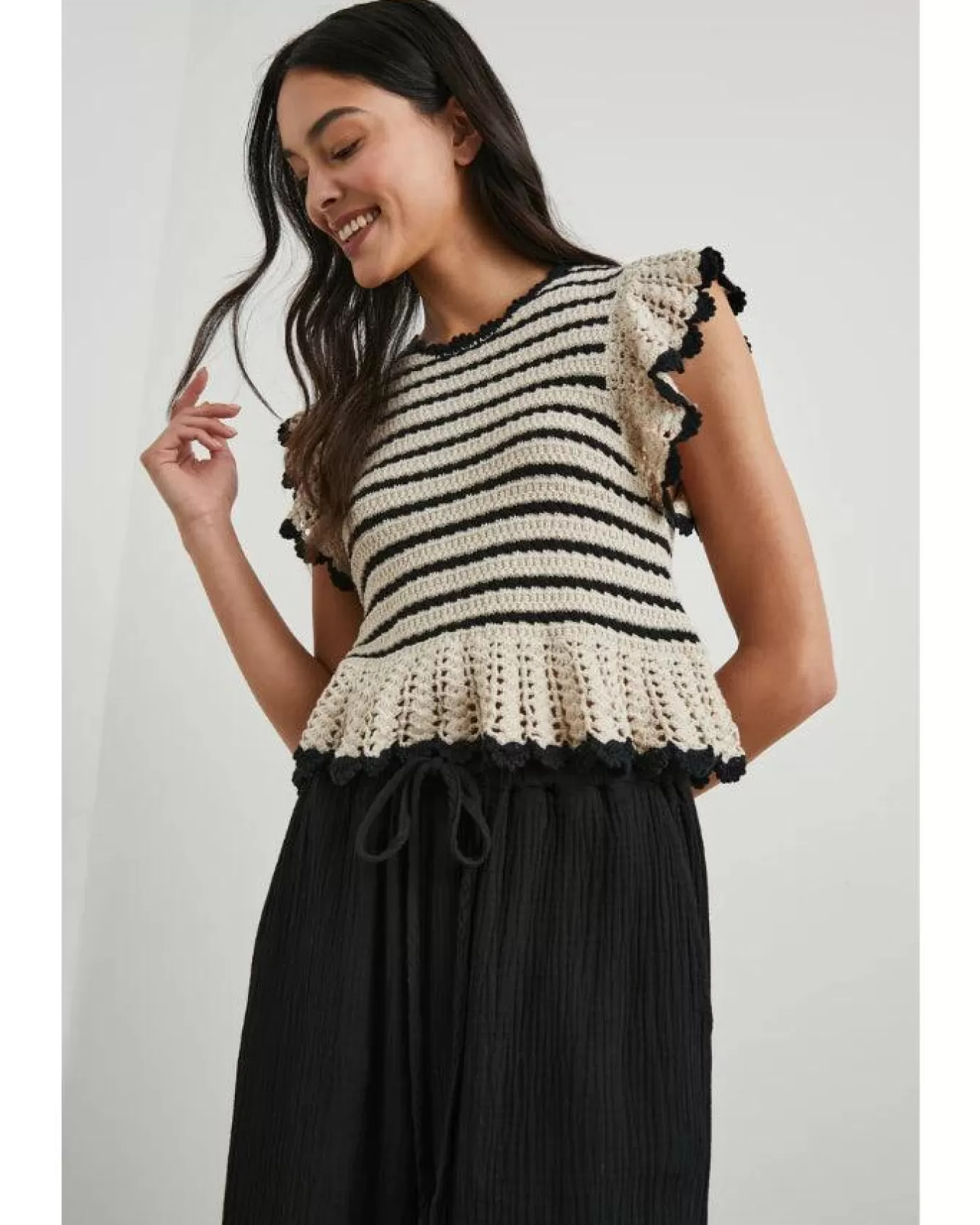 Rails cotton textured knit top with oatmeal base and contrasting black lines, flared peekaboo sleeves and hem and a back…