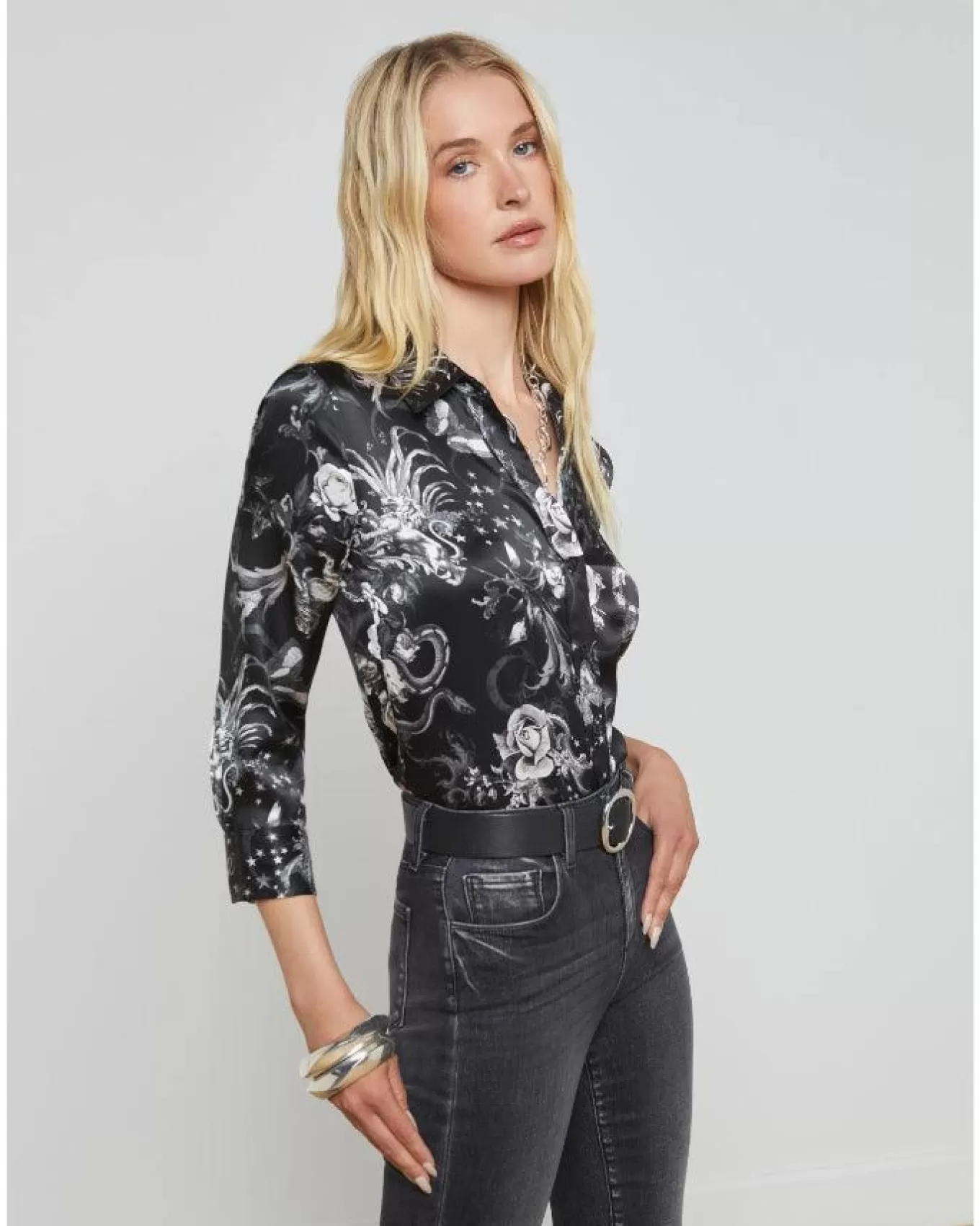 L’Agence quintessential button down blouse in lustrous silk black zodiac , three-quarter sleeves, high-low shirttail hem…