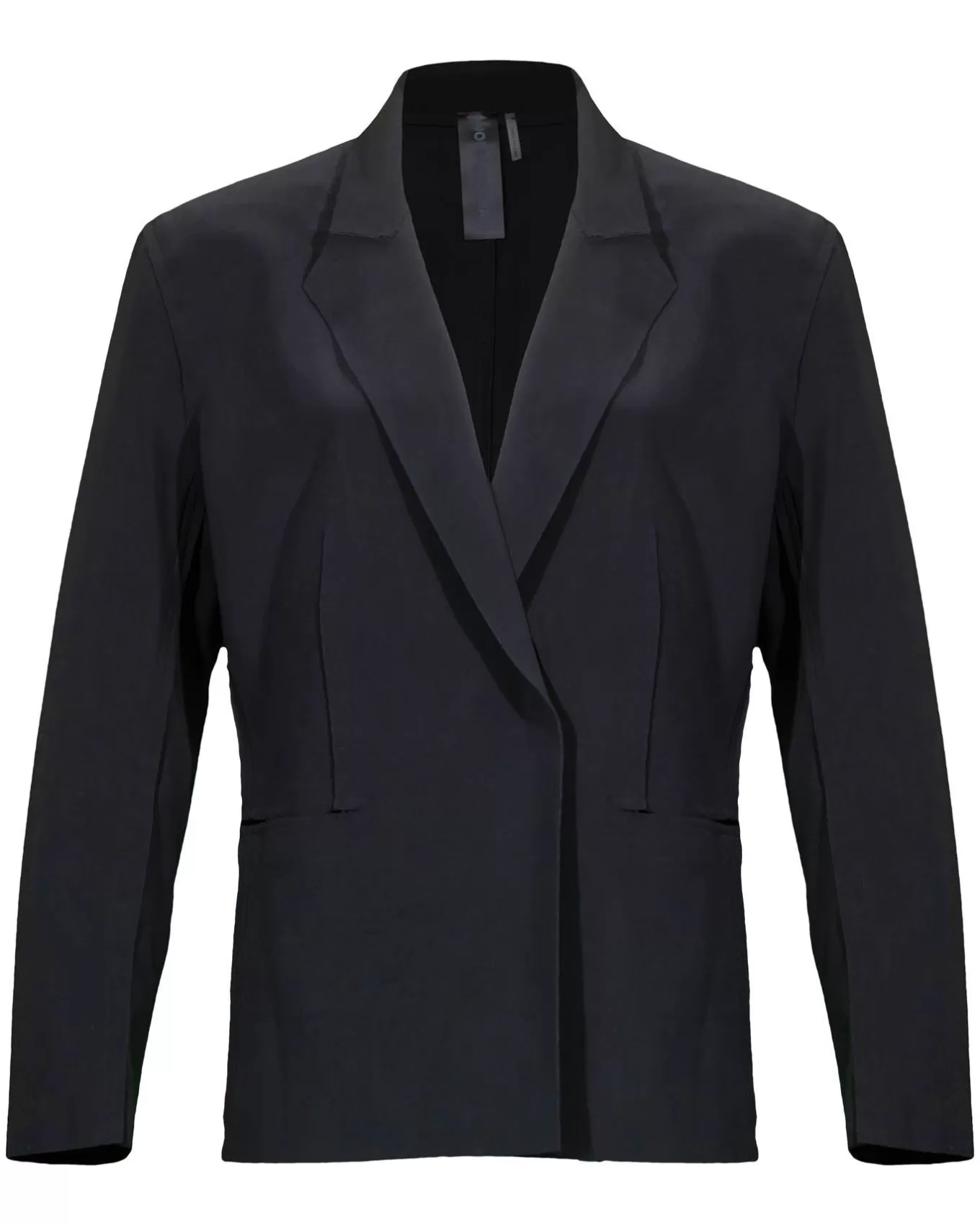 Straight fit bonded knit jacket with notched lapels, welt pockets, front velcro closure and padded shouldersColor: Black…