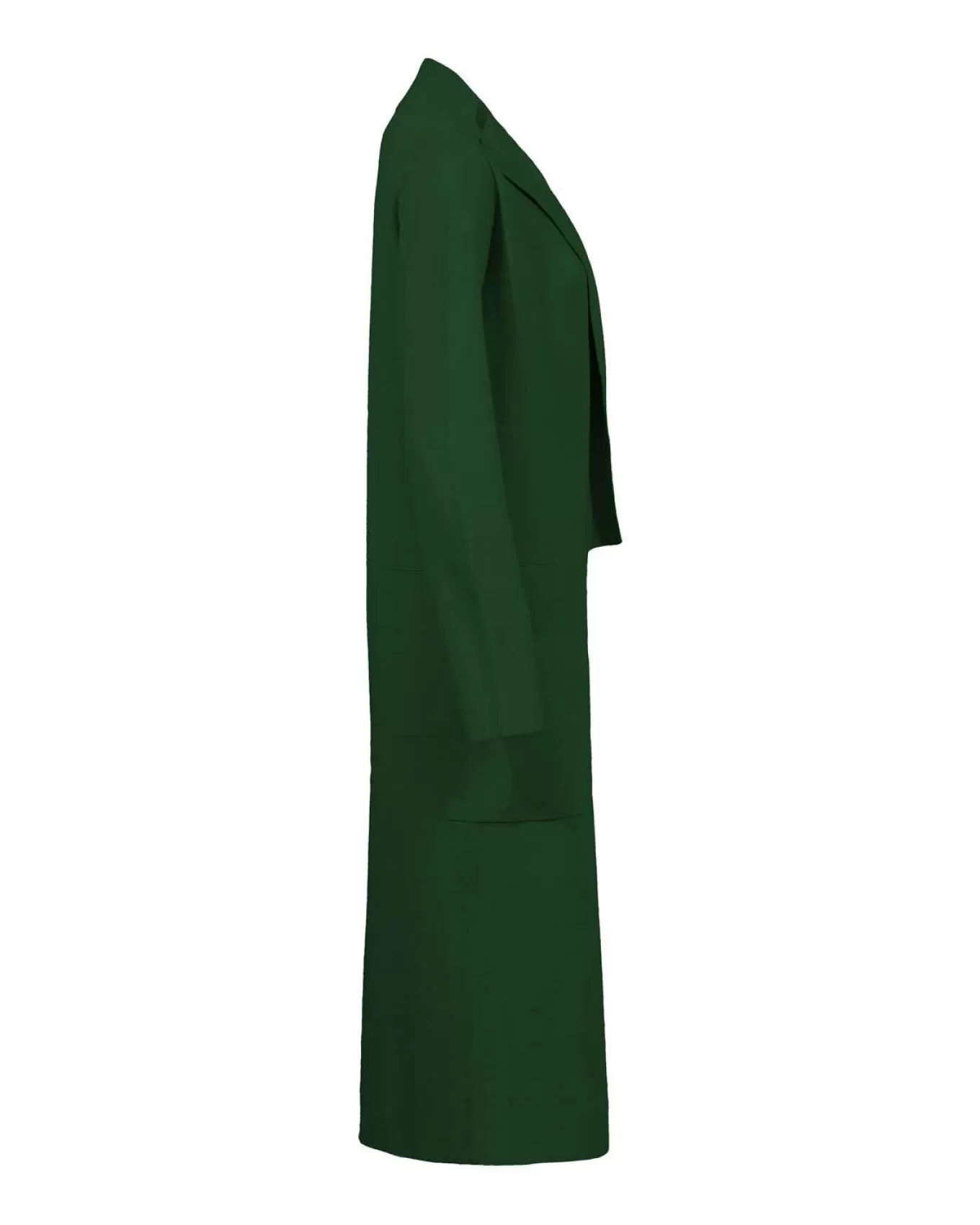 Straight fit maxi-length 44″ coatigan with large patch pockets, single lapels with slits and open front