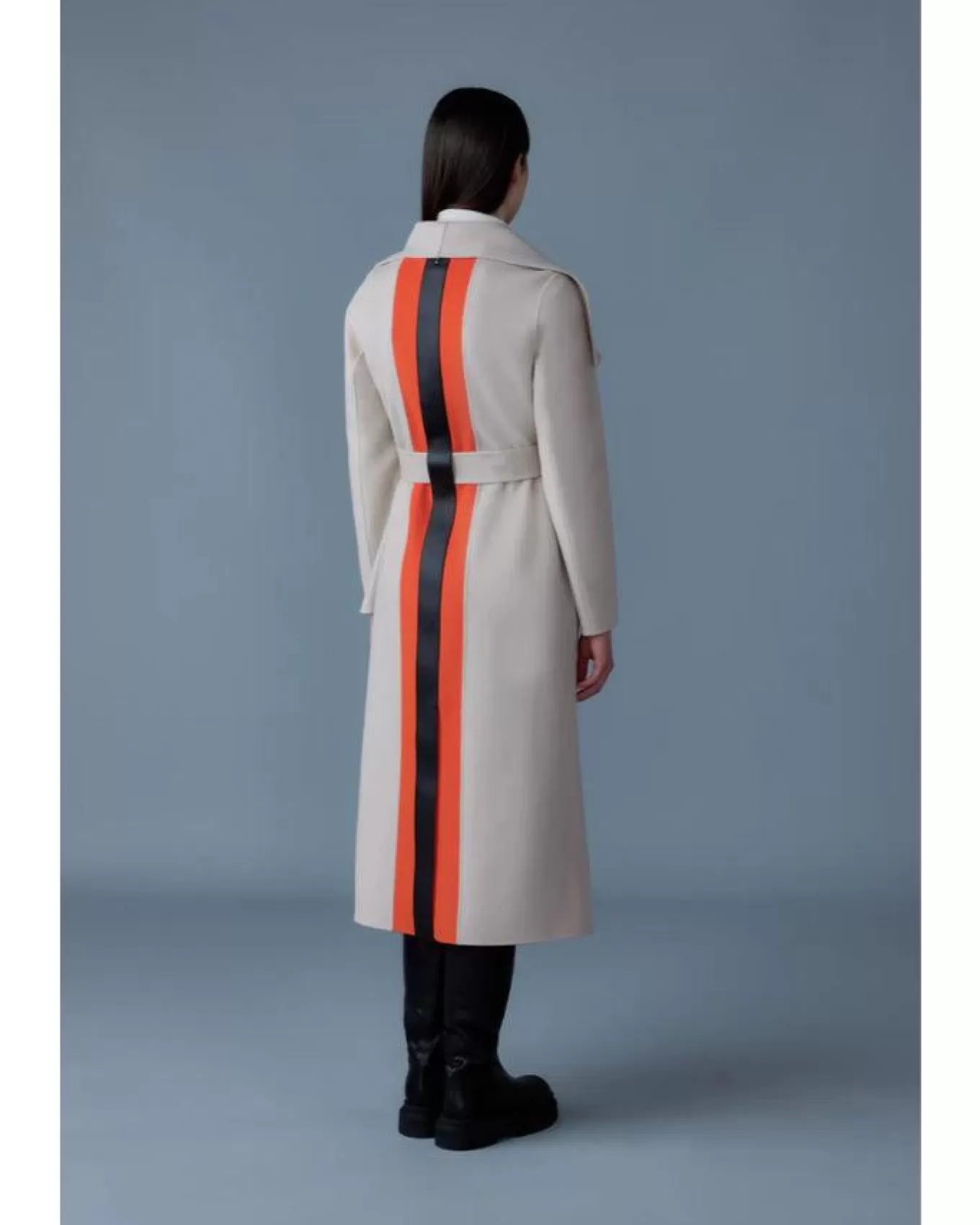 Mackage relaxed fit long wrap coat handmade from luxurious soft double-face wool. The contrast fabric and leather stripe…