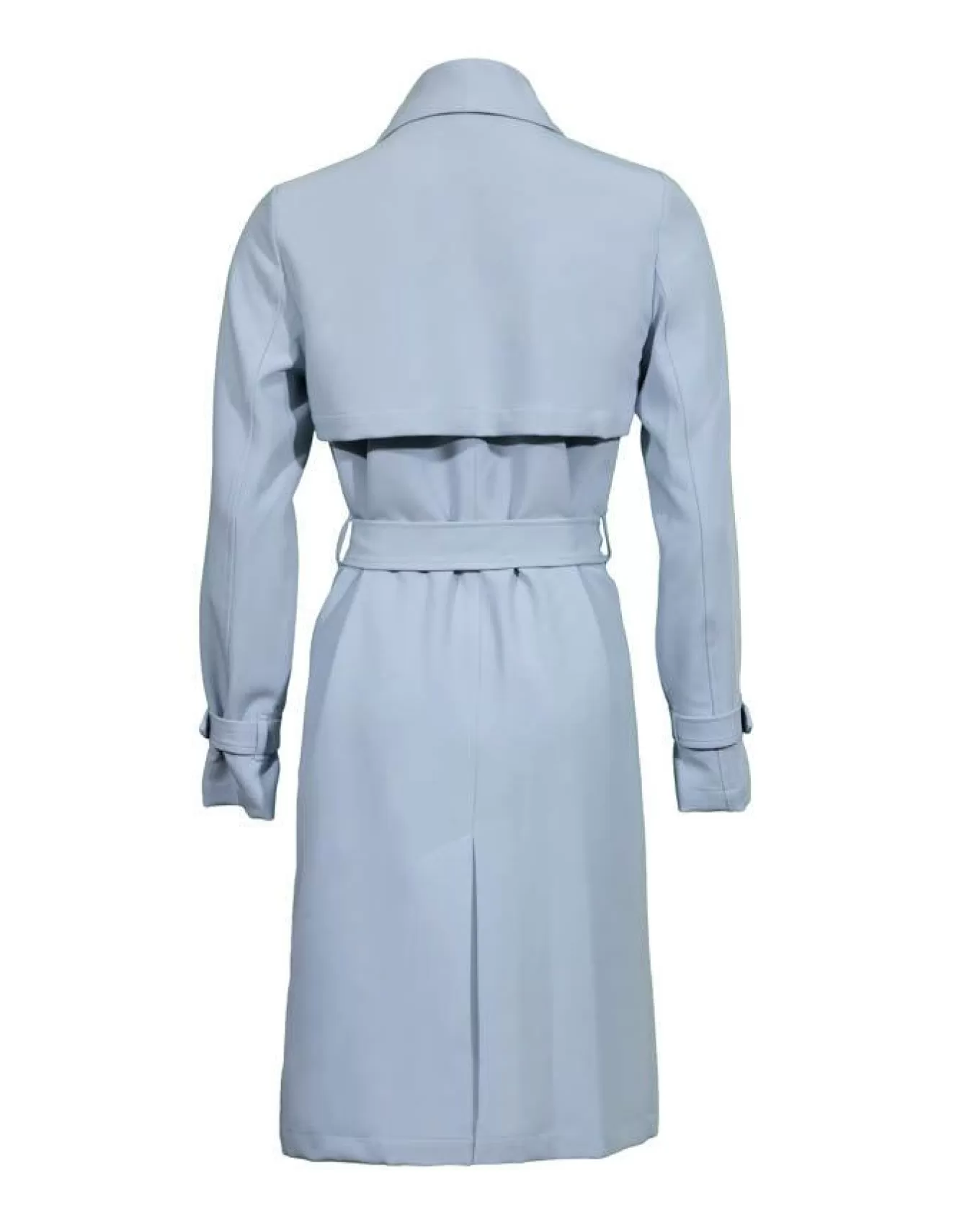 Soia & Kyo relaxed fit trench coat with cascade collar, wrap front closure with hidden button at collar, detachable tie belt, back storm flap, adjustable sleeve belt with buttons, angled welt pockets, half back lining, knee length 39″.