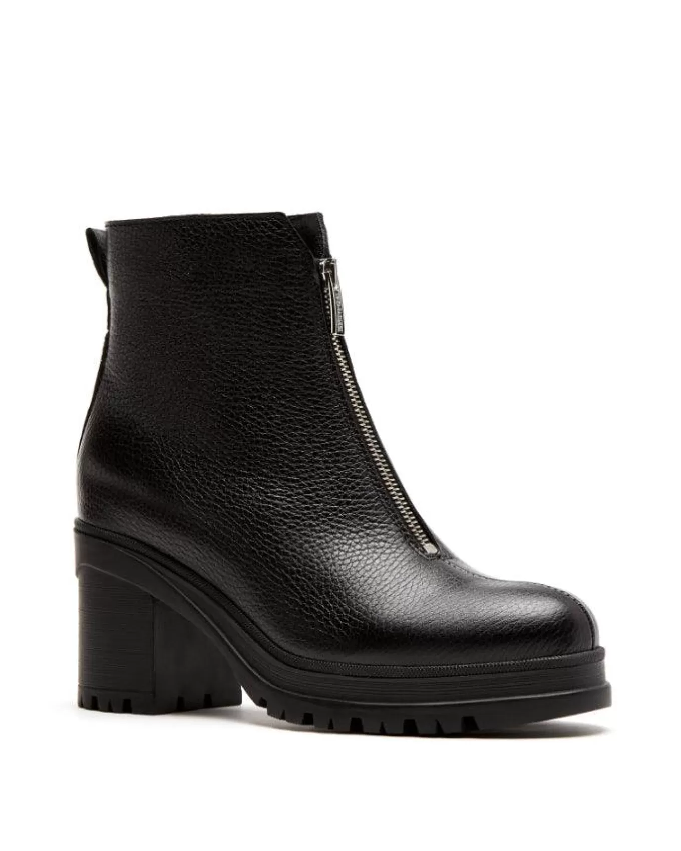La Canadienne sleek pebbled calf leather ankle boot with front zipper closure, round toe, breathable microfiber lining, memory foam insole with a cushioned memory foam heel pad, flexible TPR (thermoplastic rubber) sole provides traction on wet surfaces and 3″ lug rubber block heel with 1″ platform.