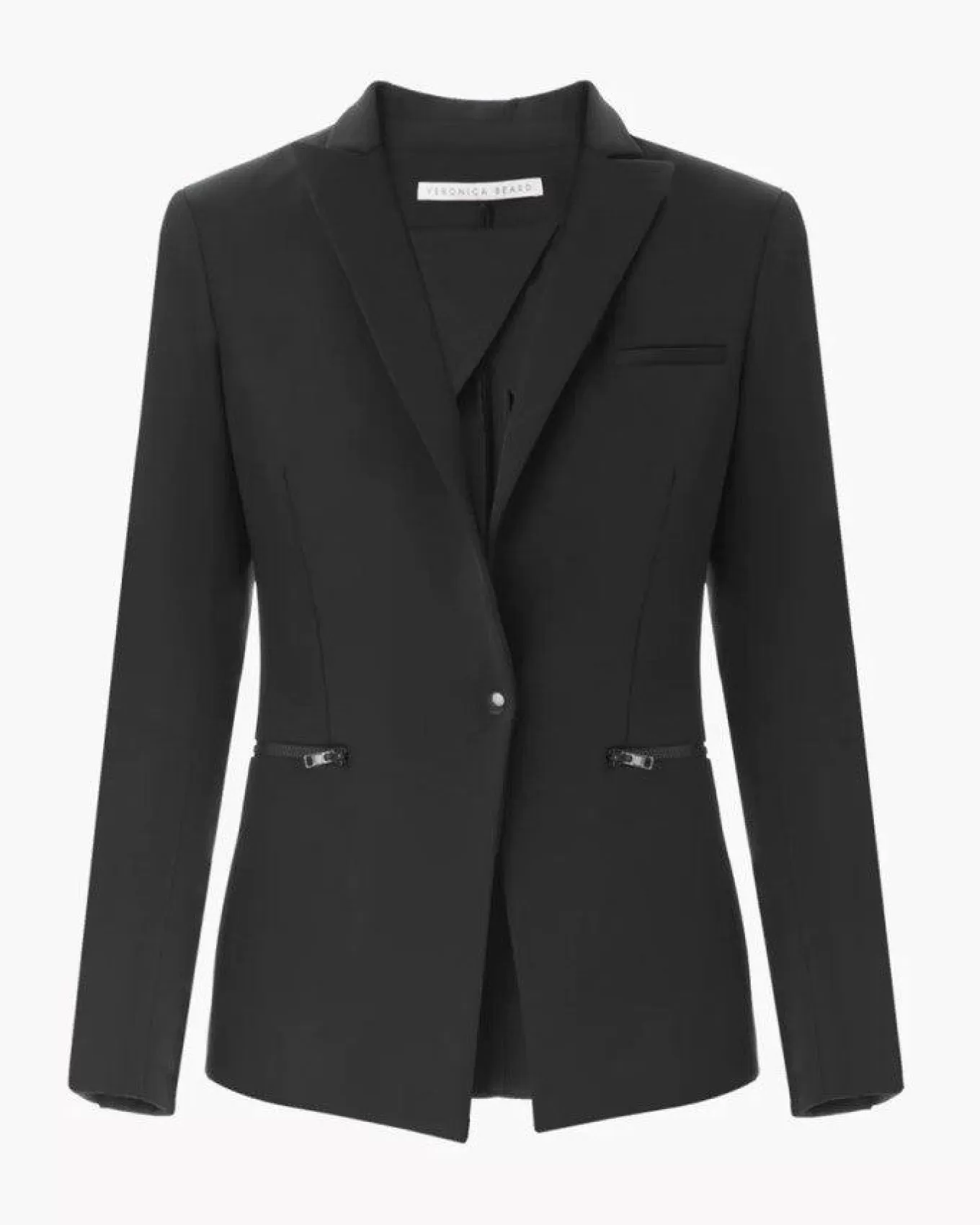One Button Scuba JacketPeaked LapelExposed Zipper Welted PocketsFitted Shape Cut to the Hip4 Button Sleeve DetailBack Sl…