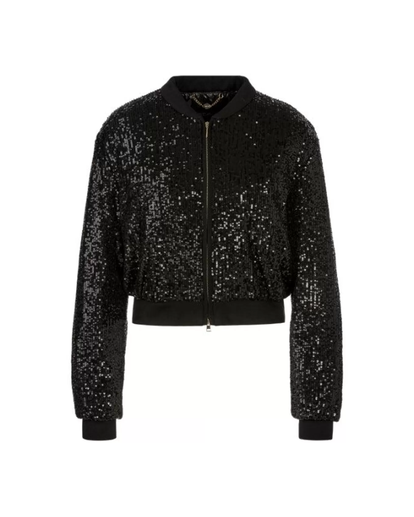 Marc Cain glamorous blouson jacket features all-over mini sequins, rounded stand-up collar, jersey cuffs, a wide short c…