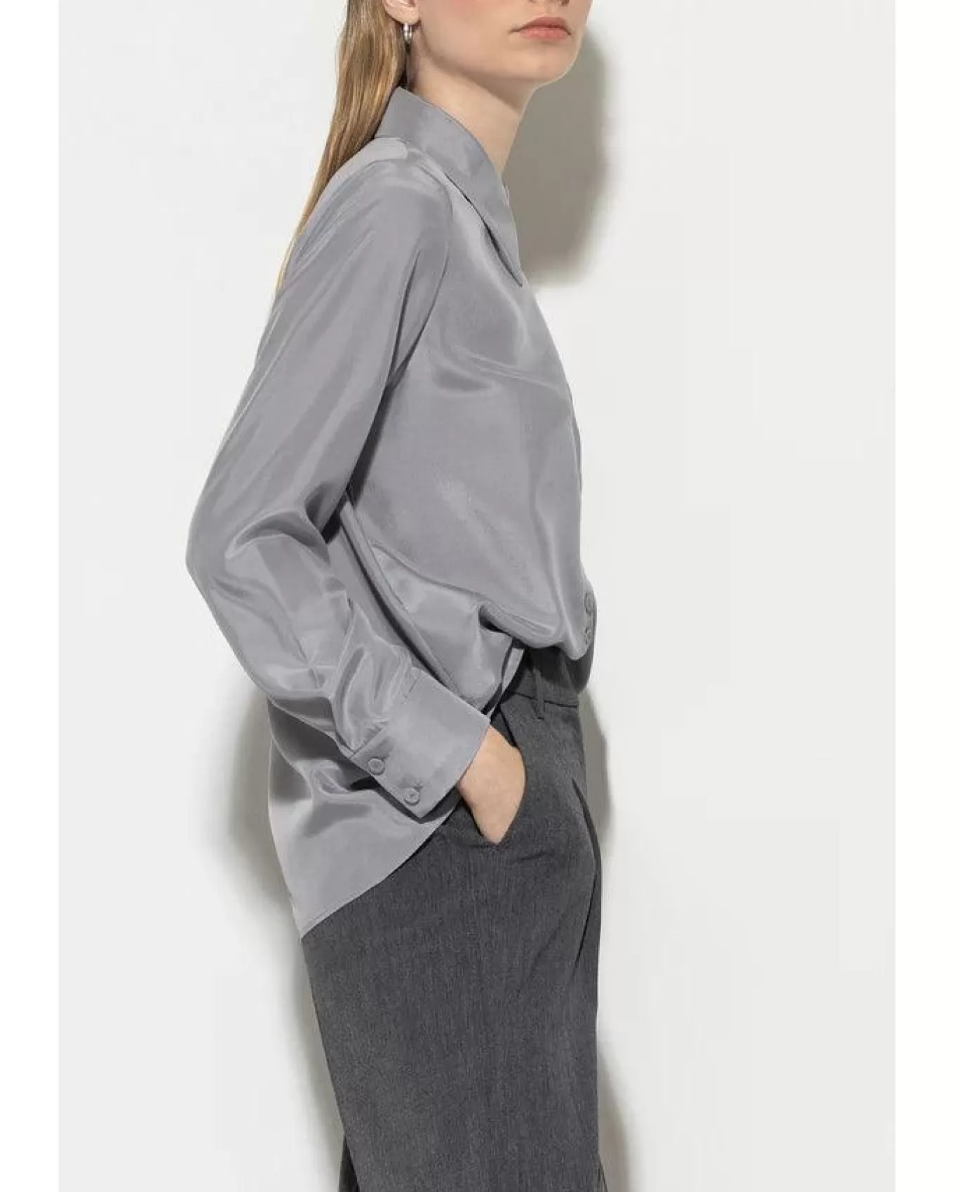 Luisa Cerano lightweight shirt blouse in a matt shimmering silk with a tapered shirt collar, button cuffs, round hem and double button detail front closure.